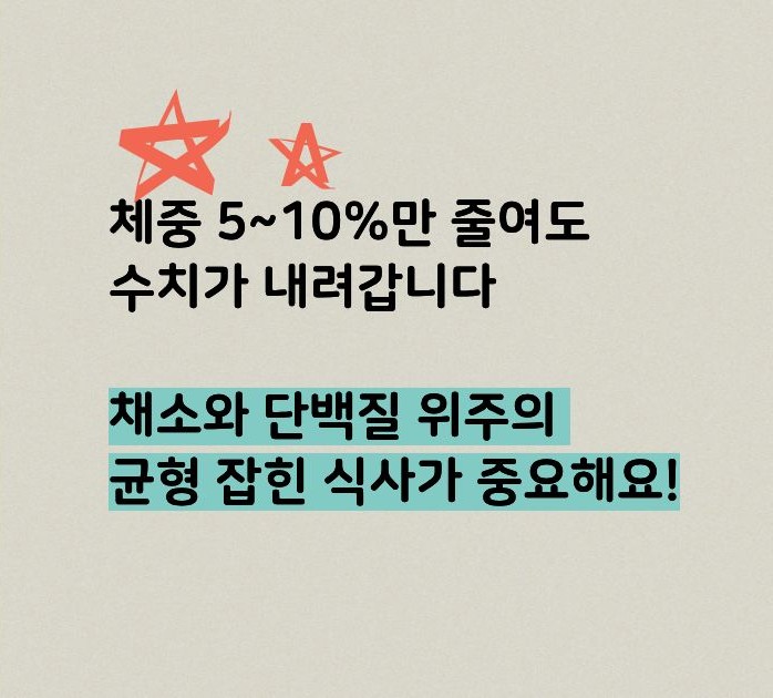 체중을 5~10%만 감량해도 당화혈색소(HbA1c)가 유의미하게 낮아지는 효과를 얻을 수 있으며, 특히 복부비만을 집중적으로 관리하는 것이 혈당 조절과 합병증 예방에 더욱 중요합니다.