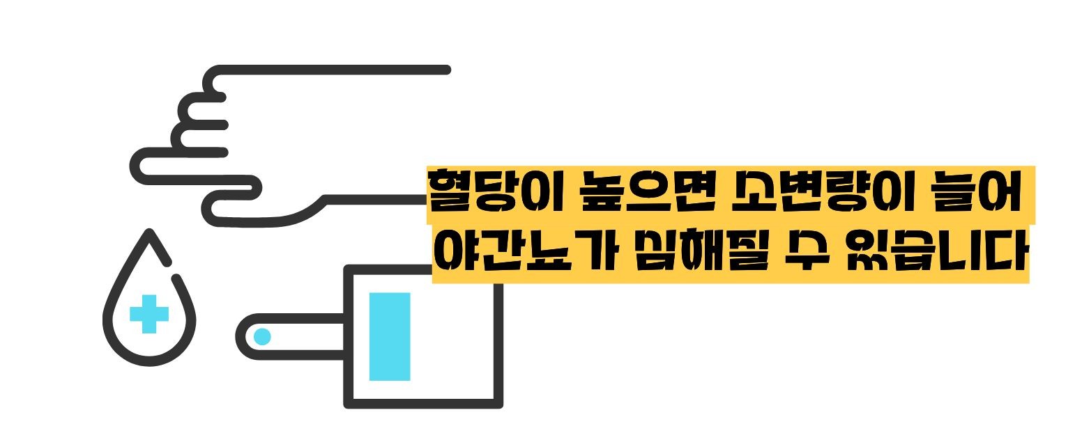 혈당이 높은 상태가 지속되면 소변으로 당이 배출되면서 소변량 자체가 증가해 밤에도 화장실을 자주 가게 됩니다. 또한 수면무호흡증은 밤중 각성을 반복적으로 유발해, 실제 소변량보다 요의를 과도하게 느끼는 경우가 많아 야간 배뇨의 원인이 될 수 있습니다.